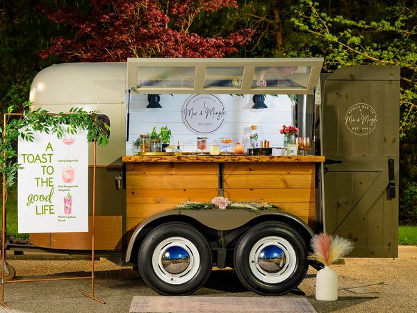 A vintage 1965 horse trailer converted into a beautiful mobile bar. The neutral color palette, warm wood tones and vintage metal accents give a timeless feel, sure to complement and enhance any aesthetic. Pricing includes 40 miles of travel from Powhatan, bar equipment, 2 certified bartenders, insurance, bar delivery, set-up, decor options, and a customized drink menu display.